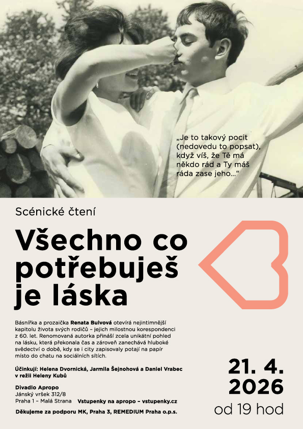 Scénické čtení z milostné korespondence ze 60. let uvedeme v Divadle Apropo, Jánský vršek 8, Malá Strana. Dopisy jsou svědectvím o době, kdy se i city zapisovaly na papír, který uchovával jejich opravdovost a hloubku. V režii Heleny Kubů hrají Helena Dvornická, Jarmila Šejnohová a Daniel Vrabec, začátek v 19 hodin, vstupenky je možné koupit přes web divadla. Těšíme se na vás.